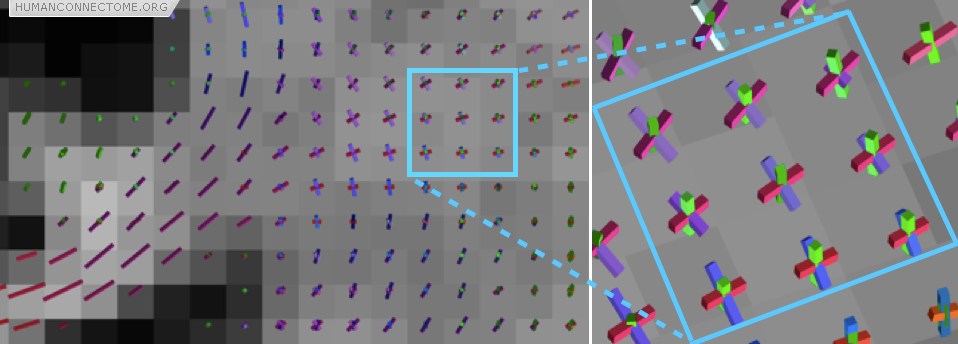 However, often these large fiber bundles cross each other, split or merge with one another, or fan out as they approach their destinations.  These places have historically caused problems for tractography but several exciting new techniques are providing dramatically improved results. Figure 2 shows that we can estimate the orientations of 3 different fiber populations that cross each other at exactly the same place.  Major technical goals of the HCP are: to compare these new techniques and select the best one; to optimize data acquisition to provide significant improvement in reconstruction accuracy; and to extend these techniques to the common situations where fiber bundles do not cross one-another, but instead spread or fan as they split or approach their destination.