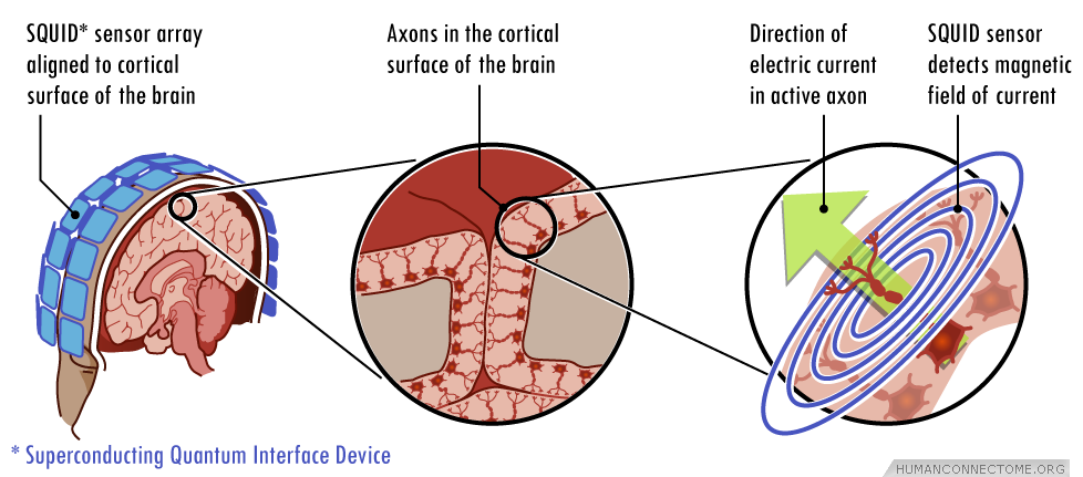 MEG (magnetoencephalography) and EEG (electroencephalography) are non-invasive electrophysiological techniques for recording brain activity. EEG is based on measuring voltage sensed by an array of electrodes placed on the scalp. MEG is based on measuring the magnetic field outside the head using an array of very sensitive magnetic field detectors (magnetometers). The signals recorded by EEG and MEG directly reflect current flows generated by neurons within the brain. The temporal frequency content of these signals ranges from less than 1 Hz (one cycle per second) to over 100 Hz (100 cycles per second). This rich spectral content offers a view of the brain operating in "real time."
